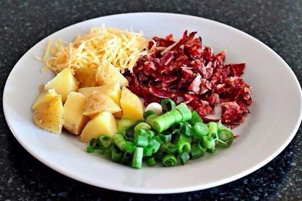 6. Одну картофелину нарезать кубиком, бекон и лук также измельчить ножом.